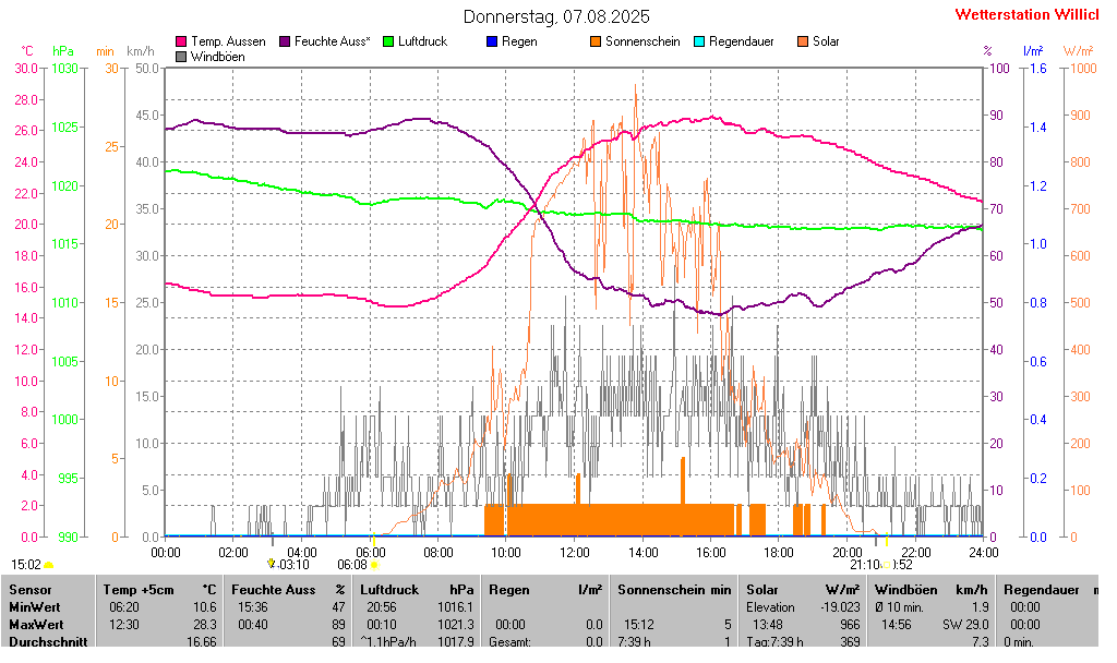 | Temperatur Außen +5cm | 16.7 °C | 10.6 °C | 06:20 | 28.3 °C | 12:30 | 16.7 °C | ||||