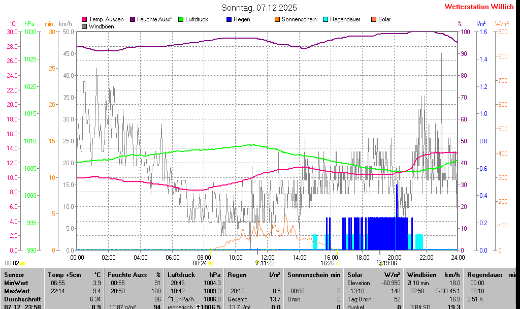 | Temperatur Außen +5cm | 8.9 °C | 3.9 °C | 06:55 | 9.4 °C | 22:14 | 6.8 °C | ||||