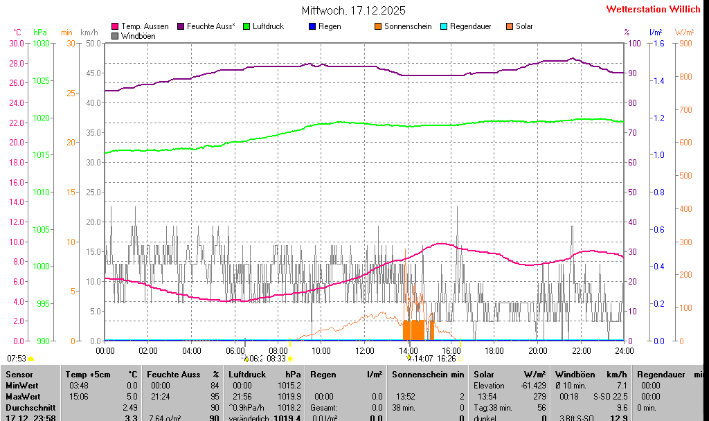 | Temperatur Außen +5cm | 3.3 °C | 0.0 °C | 03:48 | 5.0 °C | 15:06 | 2.5 °C | ||||