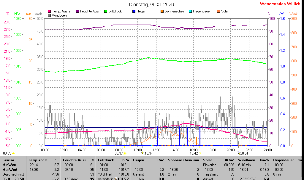 | Temperatur Außen +5cm | -6.7 °C | -6.7 °C | 22:14 | -2.2 °C | 13:36 | -4.4 °C | ||||