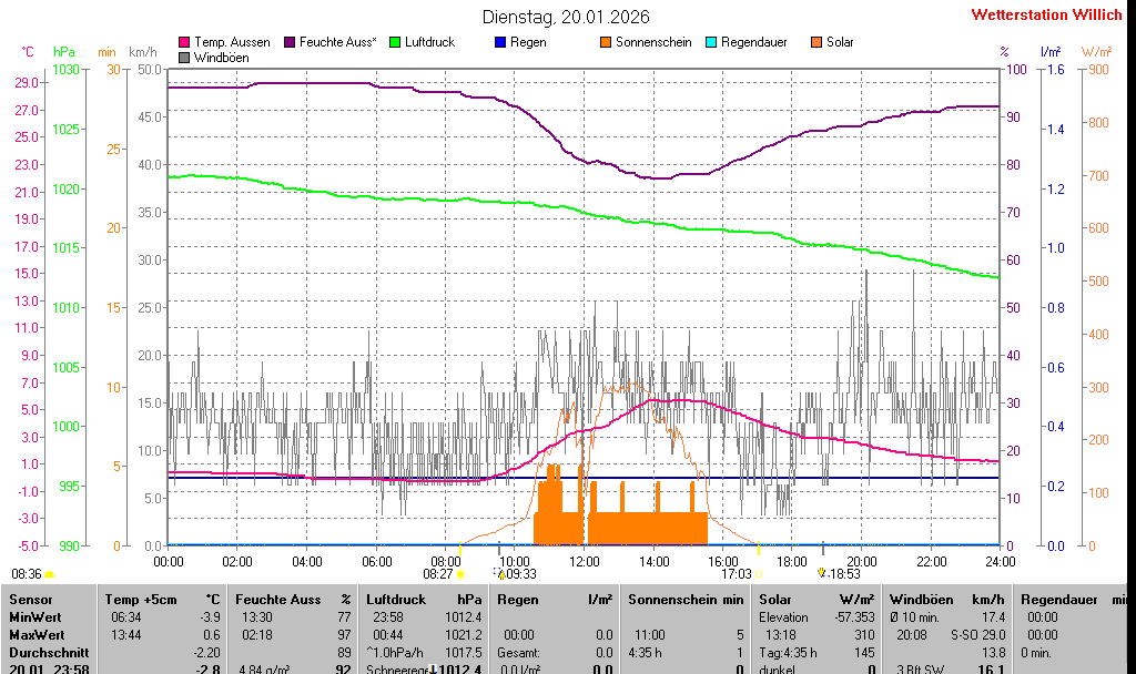| Temperatur Außen +5cm | -2.8 °C | -3.9 °C | 06:34 | 0.6 °C | 13:44 | -2.2 °C | ||||