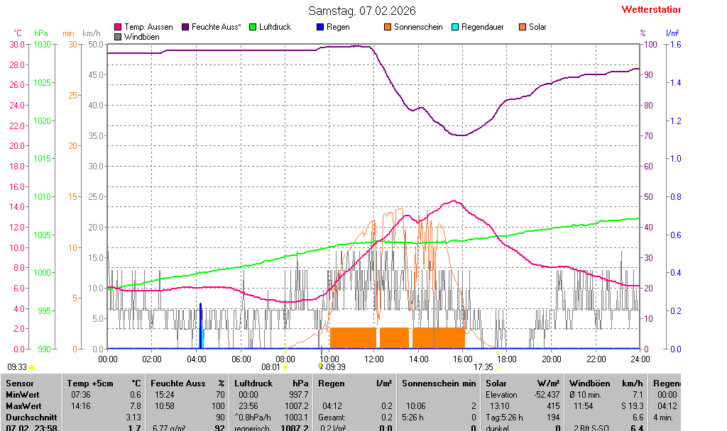 | Temperatur Außen +5cm | 1.7 °C | 0.6 °C | 07:36 | 7.8 °C | 14:16 | 3.1 °C | ||||