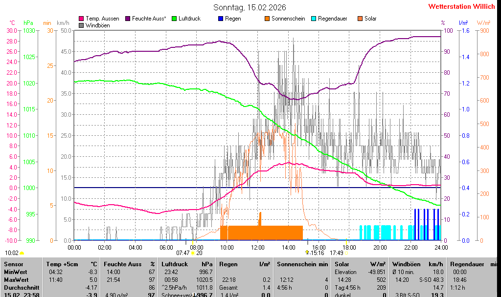 | Temperatur Außen +5cm | -3.9 °C | -8.3 °C | 04:32 | 5.0 °C | 11:40 | -4.2 °C | ||||