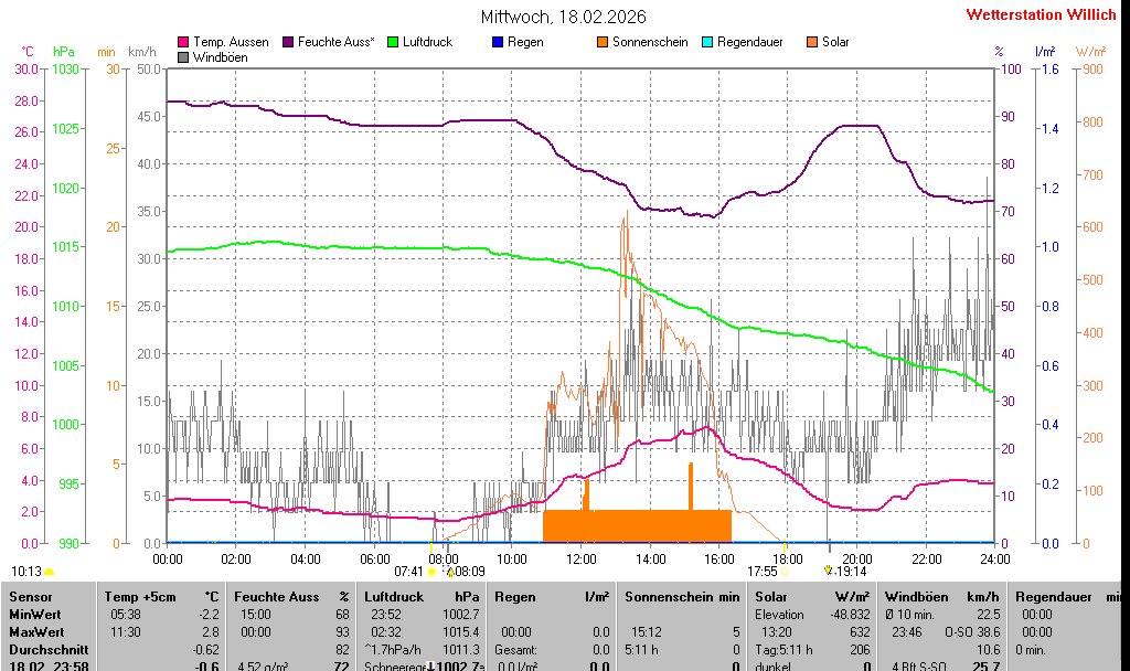 | Temperatur Außen +5cm | -0.6 °C | -2.2 °C | 05:38 | 2.8 °C | 11:30 | -0.6 °C | ||||