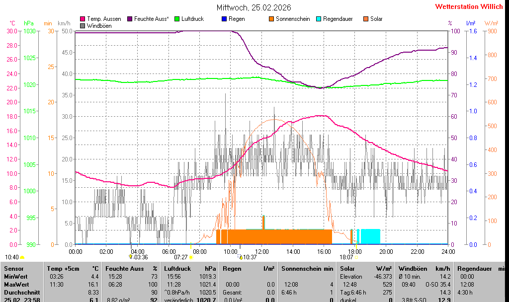 | Temperatur Außen +5cm | 6.1 °C | 4.4 °C | 03:26 | 16.1 °C | 11:30 | 8.3 °C | ||||