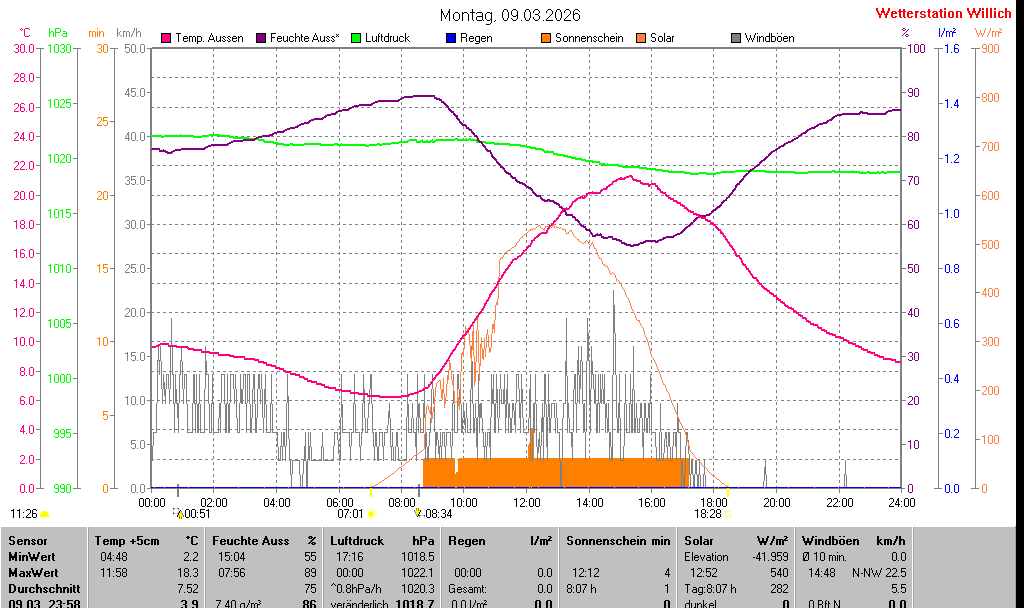 | Temperatur Außen +5cm | 3.9 °C | 2.2 °C | 04:48 | 18.3 °C | 11:58 | 7.5 °C | ||||
